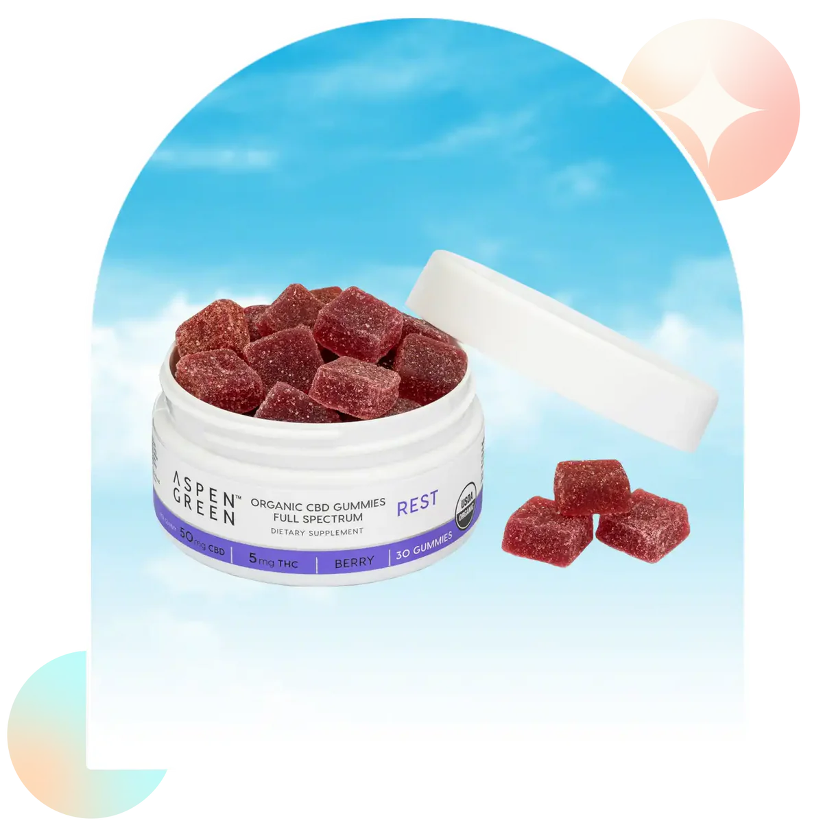 - Per 1 gummy (2 servings): ~50mg CBD and 5mg THC